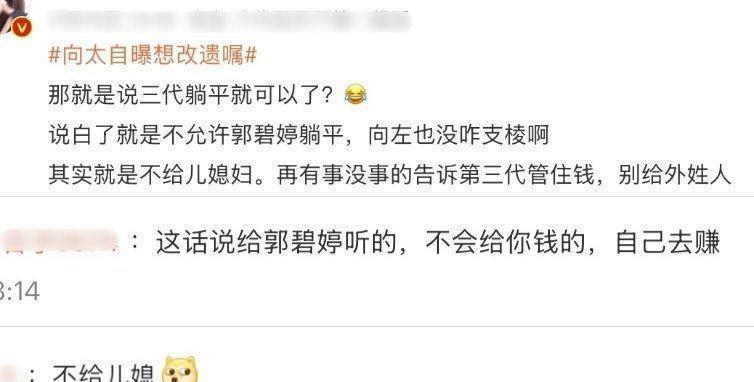 她不仅被网友拿来当乐子,还经常成为婆婆视频里的主角,不是爆她爸得癌症的料,就是隔三岔五整出点新花样。你瞧,向太又说起她打算修改遗嘱的事儿了,打算把财产全留给第三代,一分都不给第二代,谁也别想不劳而获。