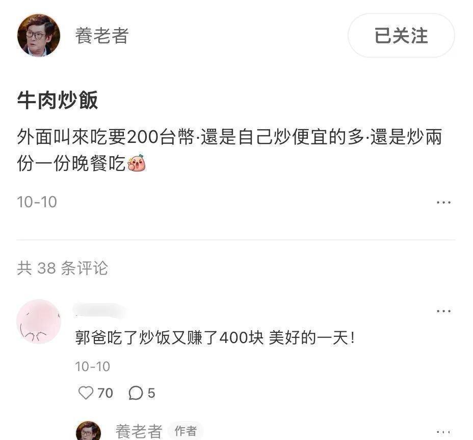 所以他要是会下厨就自己动手,想吃牛肉炒饭了就自己炒一盘,炒好后还一直念叨:外面吃得花200台币呢,自己炒不仅省钱,还能炒出够吃两顿的量。仿佛这顿饭是自己亲手做的,就净赚了四百元一样。